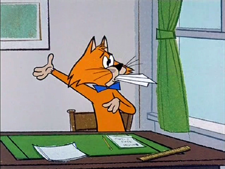 There’s a great routine in the climax of the Warner Bros. cartoon “Fool Coverage” (1952, written by Tedd Pierce) where Porky Pig qualifies for an insurance policy payout from Daffy Duck. The list of conditions keeps growing, becoming more and more outlandish and impossible, but Porky meets them all. The same sort of thing happens in this Hanna-Barbera cartoon. Mr. Jinks is challenged to a duel and told to choose the weapons. Jinks tries to come up with one that doesn’t exist so the duel can’t go ahead.