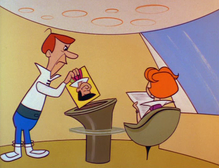 And my favourite invention of the future that belongs in the ‘60s: George’s automatic chair pulls him behind a screen and he emerges with a cigarette and a drink. Younger people today don’t understand how perfectly normal smoking was back then (the U.S. Surgeon General’s report that caused a big fuss in the media didn’t come out until 1964). And then there’s the attitude today that if a kid sees something like this, they’ll take up smoking and drinking.