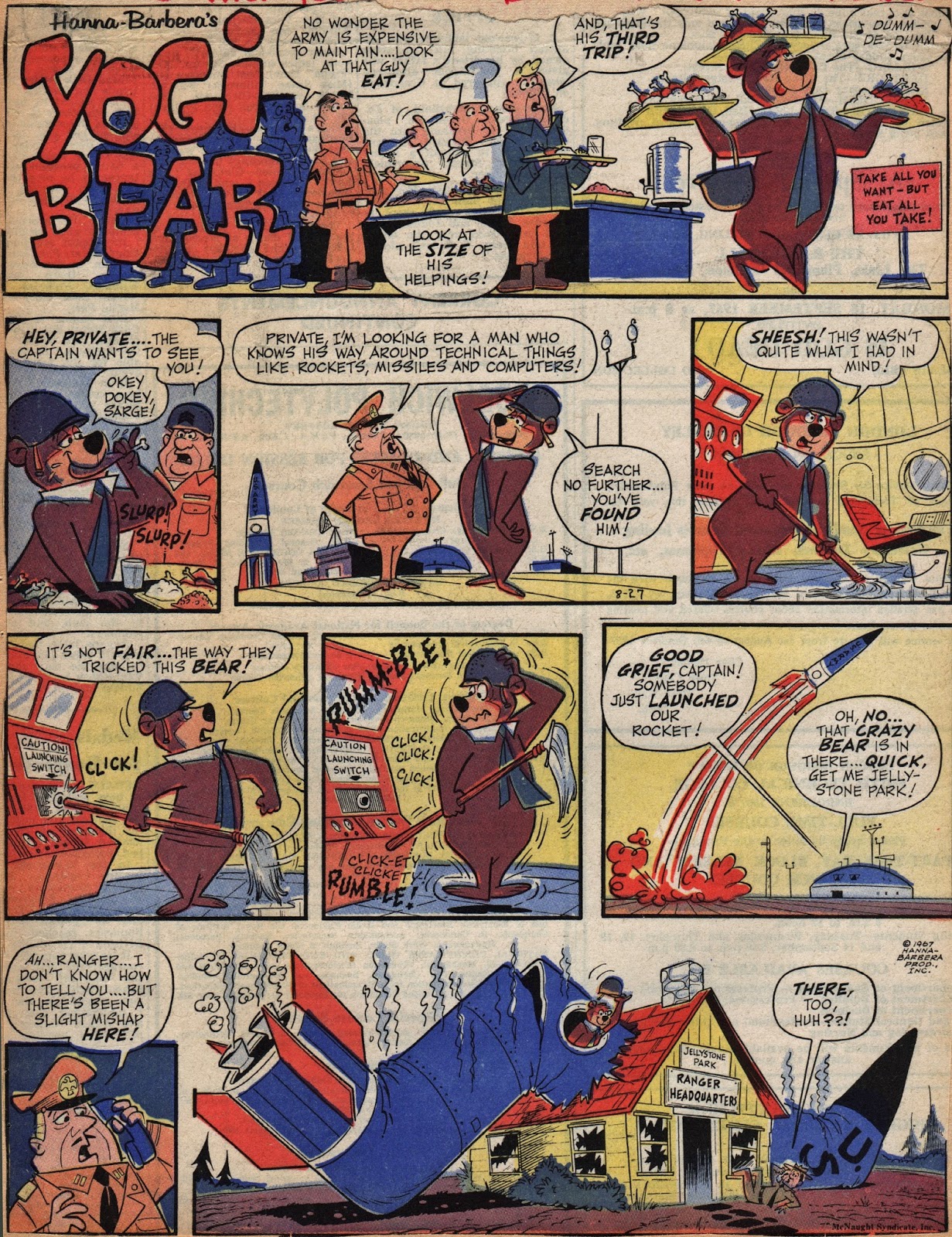 ReplyDeleteThis series of strips really feels like a Yogi cartoon. What's really different about it is that Yogi is actually in the military, unlike the cartoons "Bear Foot soldier" and "Missile bound Yogi" where the military hosts its activities in Jellystone Park.