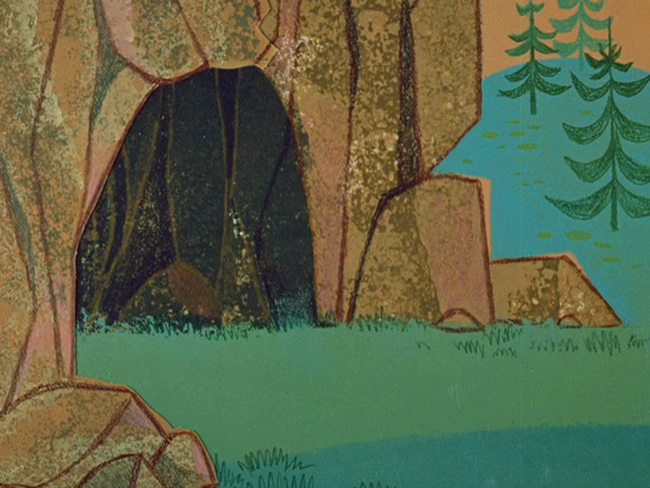 In the second season of The Huckleberry Hound Show, Yogi has a cave that isn’t consistent within a cartoon. It’s in Lullabye-Bye Bear (1959). The trees in the background are different in winter than they are in spring. These backgrounds, from what I can tell, are by Joe Montell, who painted backgrounds for Tex Avery at MGM. He left Hanna-Barbera to go to Mexico and work for Jay Ward.